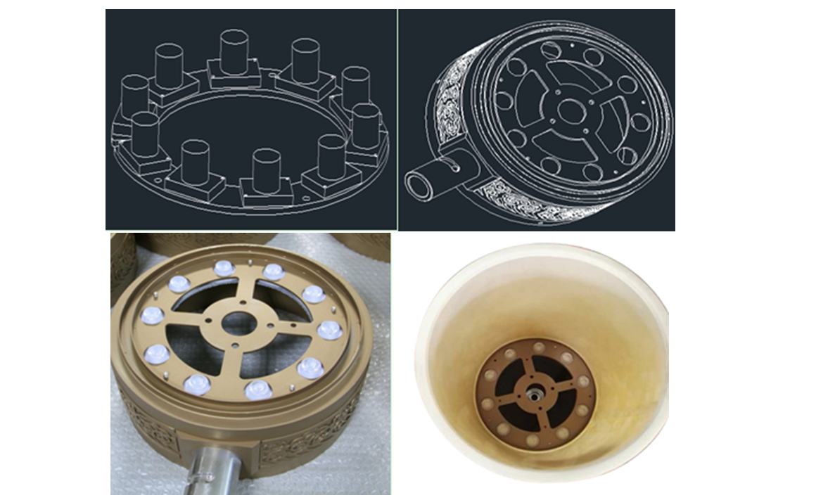 中間部分的LED光源,主要是保證燈筒的裝飾照明,由于燈筒為玻璃材質(zhì),且上照光源下沉,要保證通體均勻發(fā)光,存在很大的難度。對此LED研發(fā)團隊反復研究燈筒結(jié)構,獨特提出了側(cè)發(fā)光配光方案,為此燈筒開發(fā)了側(cè)發(fā)光LED小模塊,此小模塊選用Cree XPG2大功率燈珠,防護等級為IP66,并通過小模塊的組合應用,每個燈筒采用10個小模塊,采用由下而上的照射方式,巧妙的解決陰影,達到通體均勻發(fā)光的照射效果。并且由于采用模塊化設計,維護方面非常方便。
