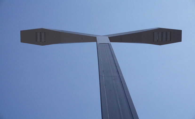 “科技之光“燈桿為多功能桿,雙臂設計,線條簡潔流暢。主光源為LED 200W,輔光源LED 100W,暖白色調(diào)。