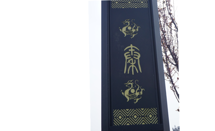 燈桿底座刻有篆體“秦”“漢”的字樣,上下圖案為秦漢時(shí)期瓦當(dāng)四神獸圖案,上下條紋為秦磚圖案提煉而來(lái)。