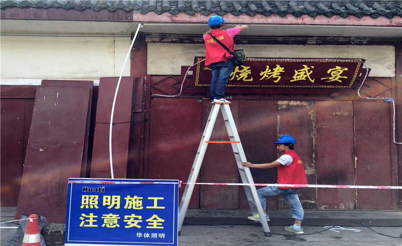 此次安裝工程時間緊、任務(wù)重,特別是天氣炎熱的夏天,是黃龍溪古鎮(zhèn)的旅游旺季,人流量特別大,為了不影響景區(qū)正常運(yùn)營,華體照明安裝隊伍選擇早上六點(diǎn)到十點(diǎn)和下午六點(diǎn)到晚上十點(diǎn)兩個時間段錯峰施工。