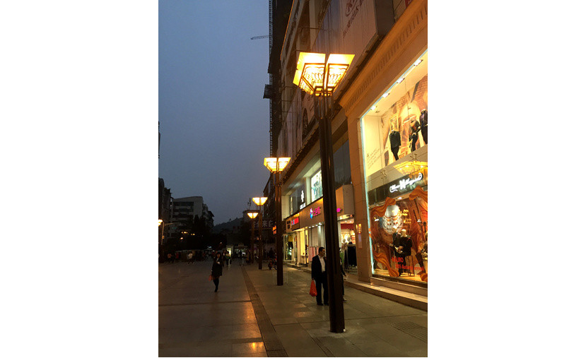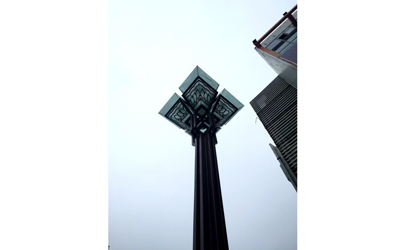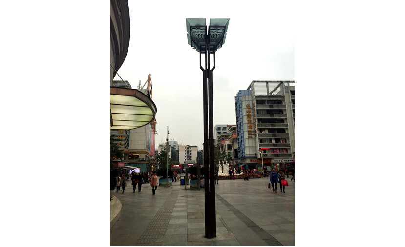 “斗”罩采用鋼化磨砂玻璃制成,搭配鏤空鐵花花紋,景觀性十足;光源采用高壓鈉燈,提高了城市道路照明的質(zhì)量、安全性和環(huán)保性;燈桿外形則充滿幾何感,通透的小矩桿增強了立體效果。