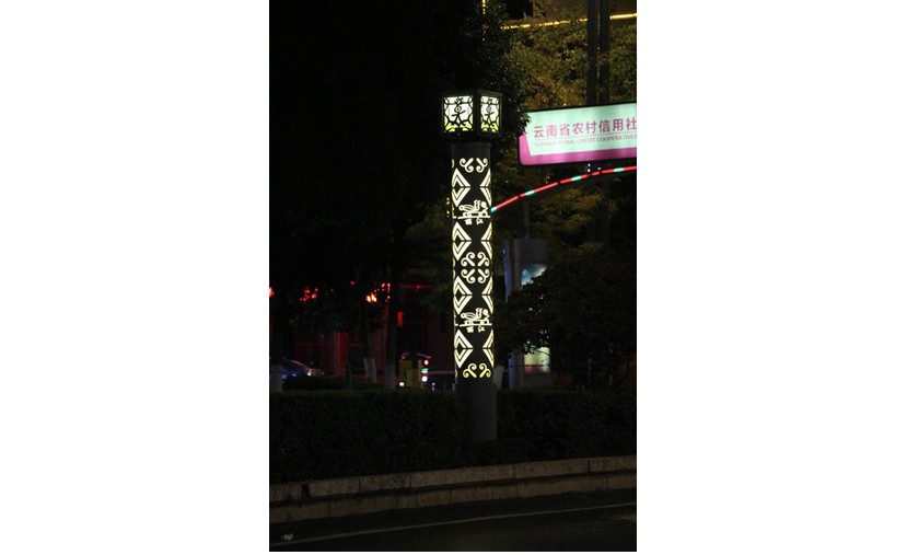 安裝于香格里拉大道中間綠化帶區(qū)域的景觀燈柱,以納西族民族傳統(tǒng)紋飾為元素,加入東巴文字“麗江”,頂部融入納西族族徽,整燈造型穩(wěn)重大氣而富有文化韻味,有了景觀燈柱作為大道玉蘭燈的補充,香格里拉大道的白天更加美觀,夜景更加靚麗。