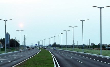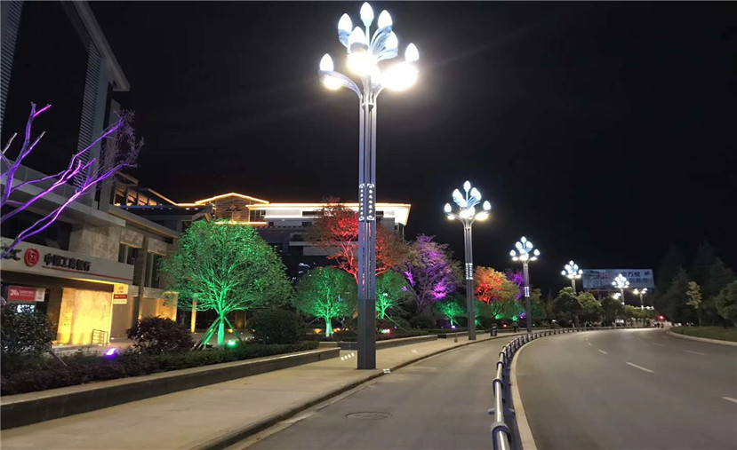 華體照明根據(jù)麗江市擁有眾多少數(shù)民族的特點,為其量身定制了八叉九火玉蘭燈500多套、雙頭庭院步道燈390多套和景觀燈柱50多套,分別布局在香格里拉大道的大道旁、人行道旁和大道中間的綠化帶區(qū)域。