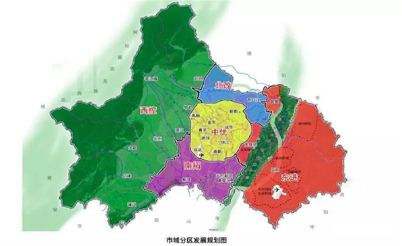 2017年4月,在中國共產(chǎn)黨成都市第十三次黨代會上,成都市委書記范銳平正式提出“東進(jìn)、南拓、西控、北改、中優(yōu)”發(fā)展戰(zhàn)略,成都的城市布局由原來的“兩山夾一城”轉(zhuǎn)變?yōu)椤耙簧竭B兩翼”,以龍泉山為界,西邊為中心城區(qū),東邊則將塑造全新的東部產(chǎn)業(yè)新城——東部城市新區(qū)。