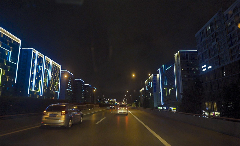 目光來到機(jī)場高速沿線,當(dāng)乘車飛馳在機(jī)場高速上時,旅客可以欣賞到兩邊的建筑樓宇夜景。投光燈在展現(xiàn)建筑夜間結(jié)構(gòu)美的同時,樓宇上的動感氛圍燈通過變化慢慢向前延伸和追逐,光影的流動體現(xiàn)的是成都的律動。