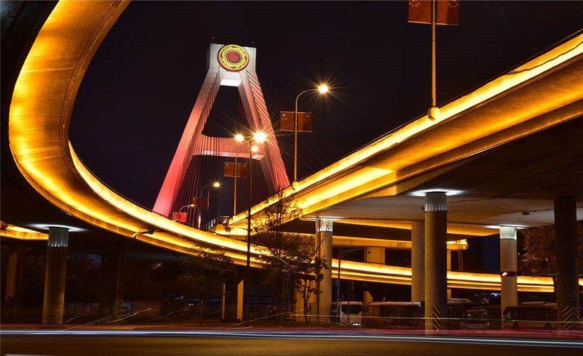 作為天府立交的靈魂,華體安裝通過(guò)遠(yuǎn)距離投光燈,照亮橋頂?shù)奶?yáng)神鳥(niǎo)徽記,在夜景燈光烘托下的太陽(yáng)神鳥(niǎo)徽記,更加突出地展現(xiàn)出天府立交這個(gè)成都地標(biāo)的夜間美。