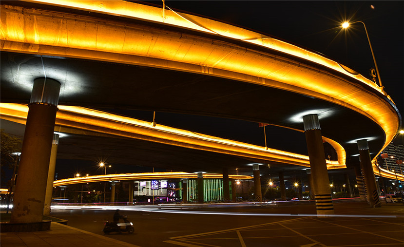 橋側(cè)和橋腹,分別通過(guò)線型投光燈和線型洗墻燈照亮的方式,采用連續(xù)暖色調(diào)的有色光以表現(xiàn)立交橋夜間的建筑美,使立交顯得更輕盈。