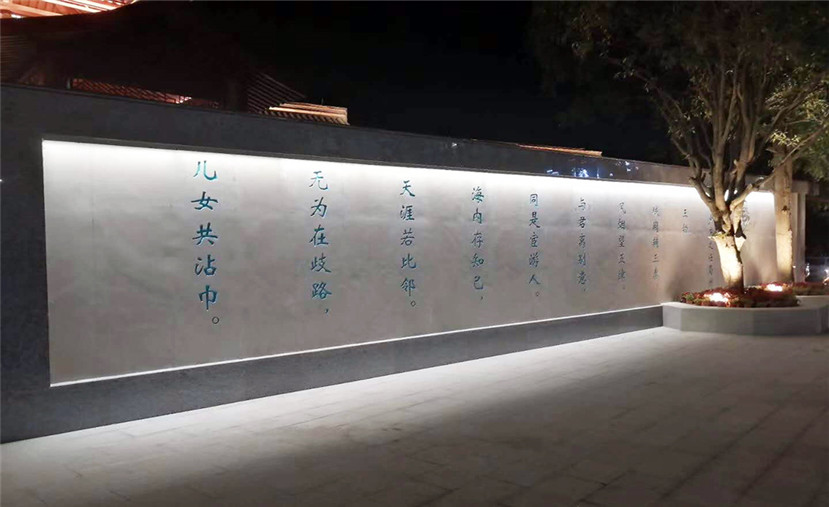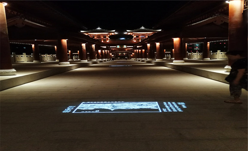 在景觀亭頂部照明及風(fēng)雨廊頂部照明的光環(huán)境下,華體結(jié)合地面原有文化浮雕,采用燈光投影的方式,將新津十二景的一筆一劃投射到地面,通過(guò)一橋,看遍新津十二景。
