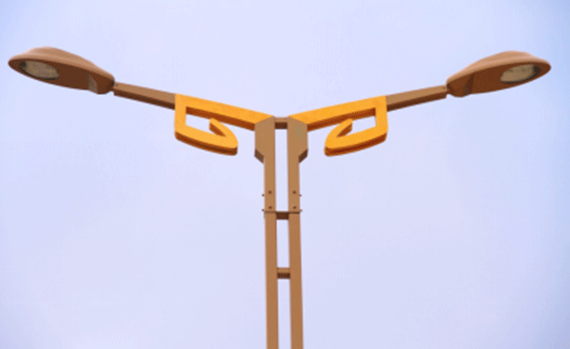 2014年,華體照明承接了廣元市區(qū)瓷蓮路蜀紋燈100盞。蜀紋燈,燈高12米,設(shè)計靈感源于古蜀文化中的青銅元素,雙臂造型,金色與黃色的銜接自然而美觀。桿體采用兩根矩桿連接而成,鏤空而通透。