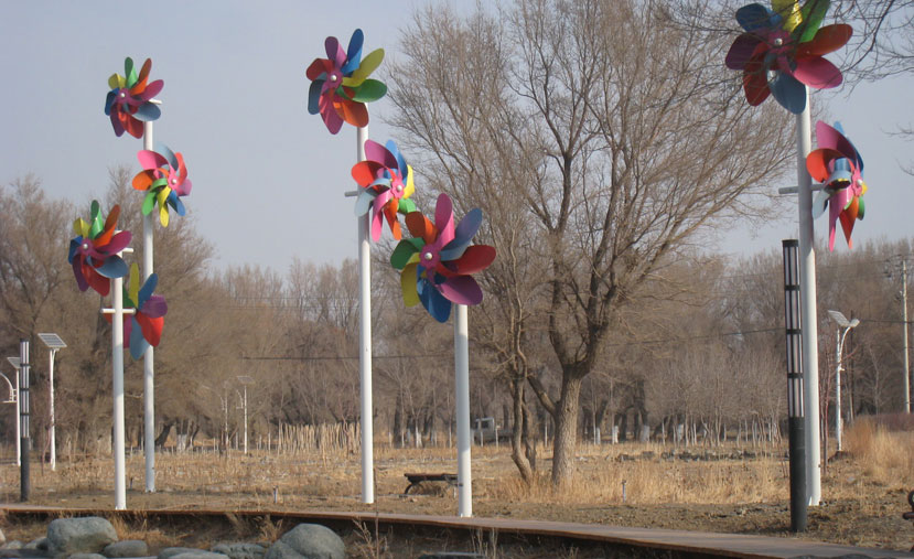 該景觀風(fēng)車由黃、綠、藍(lán)、紅、紫、灰等多彩顏色組成,風(fēng)車直徑為1.6米。每柱高度為4米至8米不等,由低到高分布,賦予時尚感。獨特的白色燈桿兩側(cè),由兩個風(fēng)車連接桿體兩側(cè),形成高低臂造型,對稱性強(qiáng),形成獨特的風(fēng)車景觀。