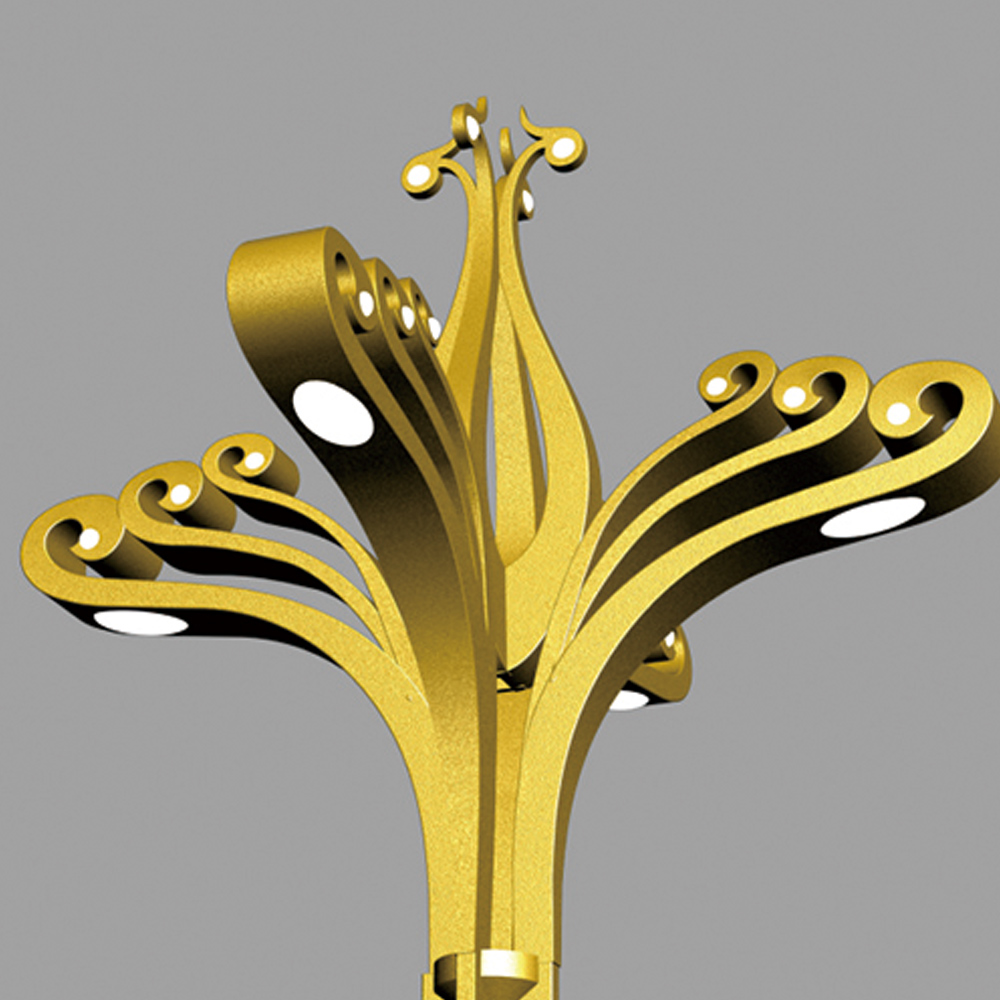 燈型采用中國(guó)傳統(tǒng)的四向?qū)ΨQ手法,展現(xiàn)出鳳的高貴與華麗,可謂是“毫光灑風(fēng)雨,紋彩動(dòng)云霓”;
