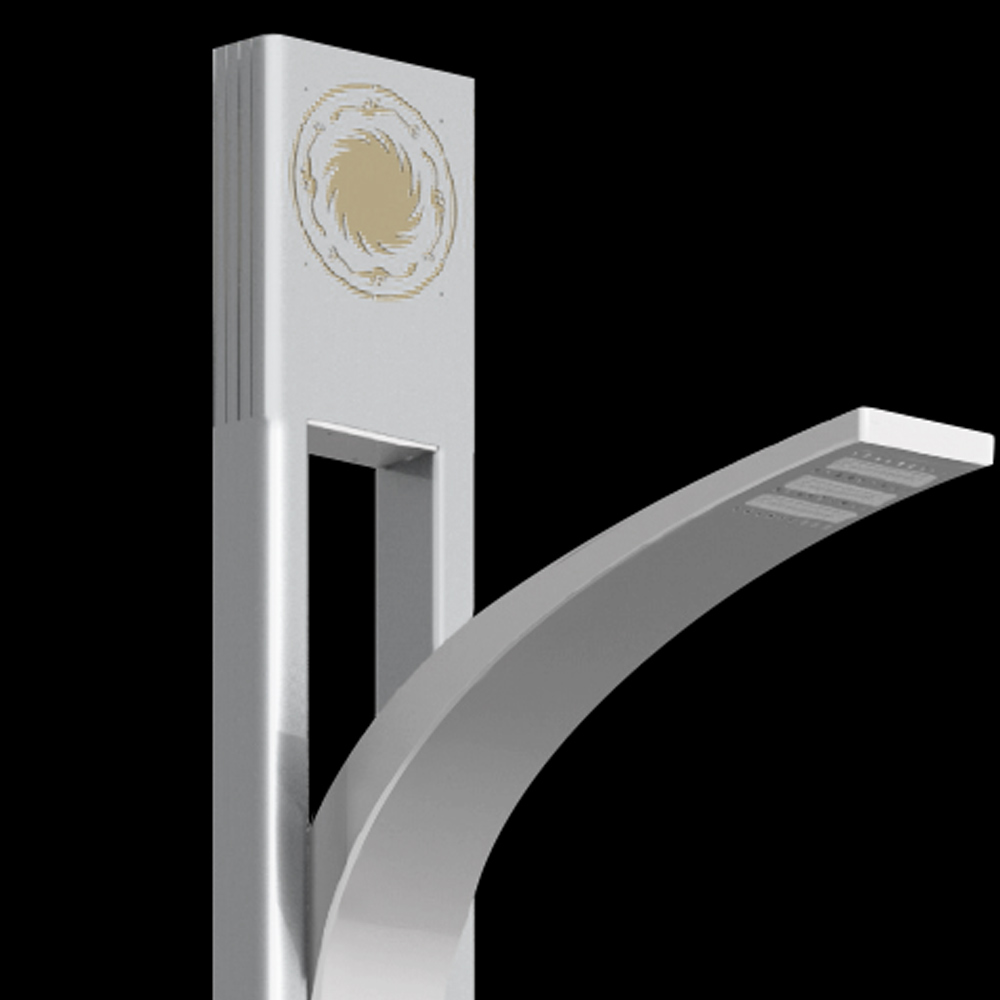 此灯以掀开的窗帘和窗户为设计元素,蕴含通向未来的意义,灯臂正面内嵌夹胶玻璃作为装饰,夜晚呈现晶莹的光带;
